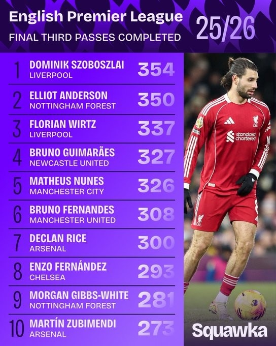 1月10日讯 数据机构squawka统计了本赛季英超在进攻三区的成功传球次数情况,索博斯洛伊压安德森居首。本赛季英超进攻三区成功传球榜:1. 索博斯洛伊(利物浦),354次2. 埃利奥特·安德森(诺丁汉森林),350次3. 维尔茨(利物浦),337次4. 布鲁诺·吉马良斯(纽卡斯尔),327次5. 马特乌斯·努内斯(曼城),326次6. B费(曼联),308...